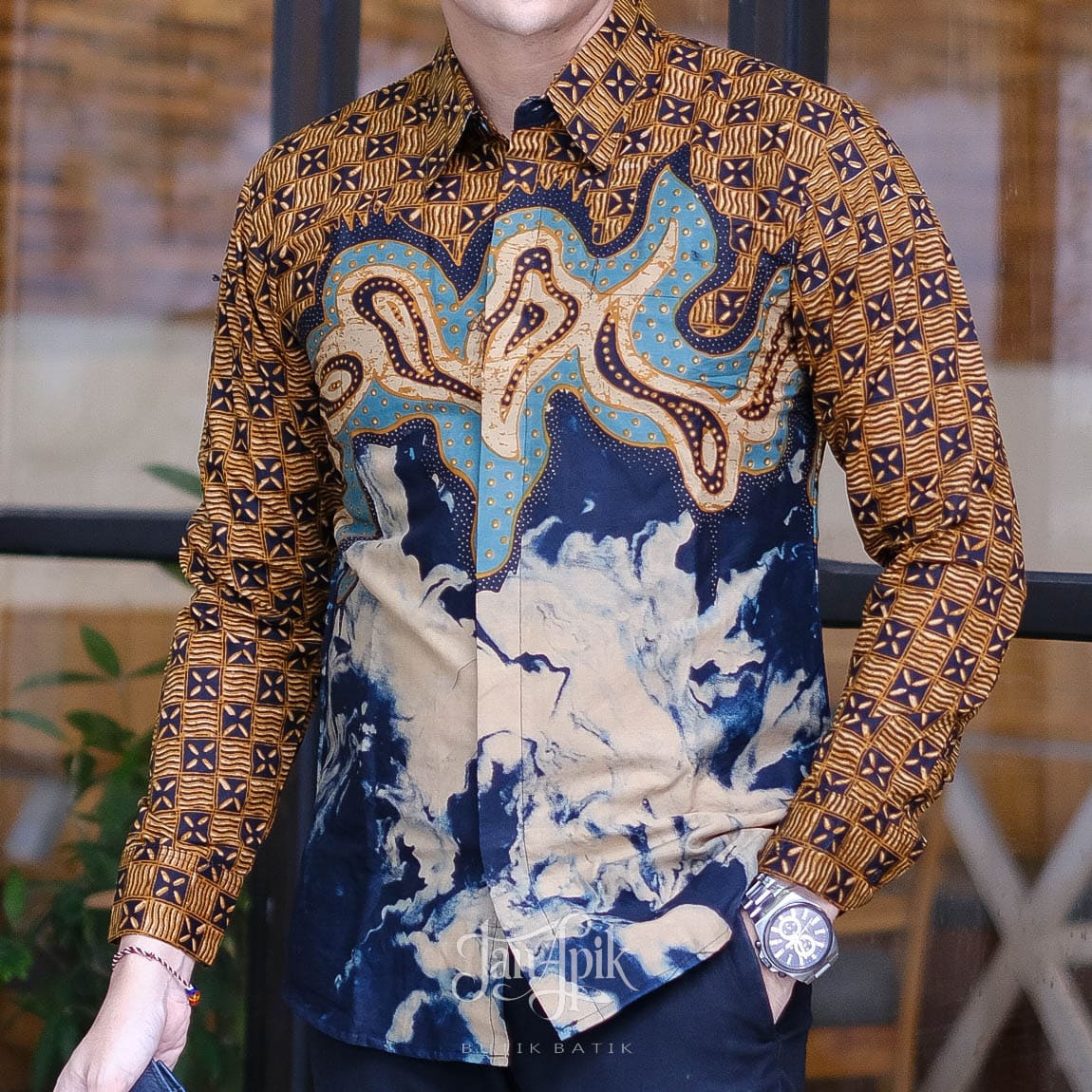 Tampilkan gaya terbaik Anda dengan Baju Batik Pria Premium Motif Tirta Segara, perpaduan motif klasik, warna coklat dipadukan dengan warna motif biru dan sentuhan modern yang memberikan kesan mewah, berkelas, dan penuh wibawa. Dibuat dengan teknik printing cabut warna handmade oleh pengrajin berpengalaman sehingga secara visual meghasilkan kain batik yang sangat mendekati batik tulis yang merupakan kelas tertinggi kain batik.